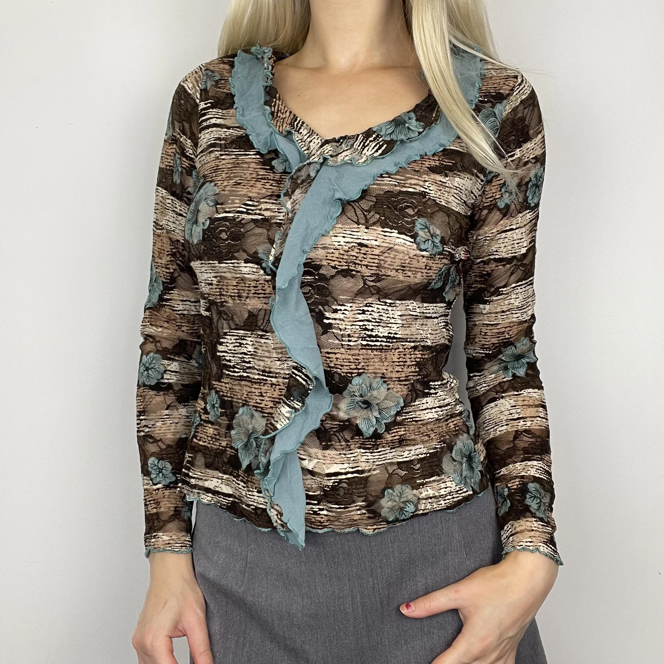 XL blue brown white frilly ruffle fairy lace button up three-quarter length sleeve mesh patterned top blouse