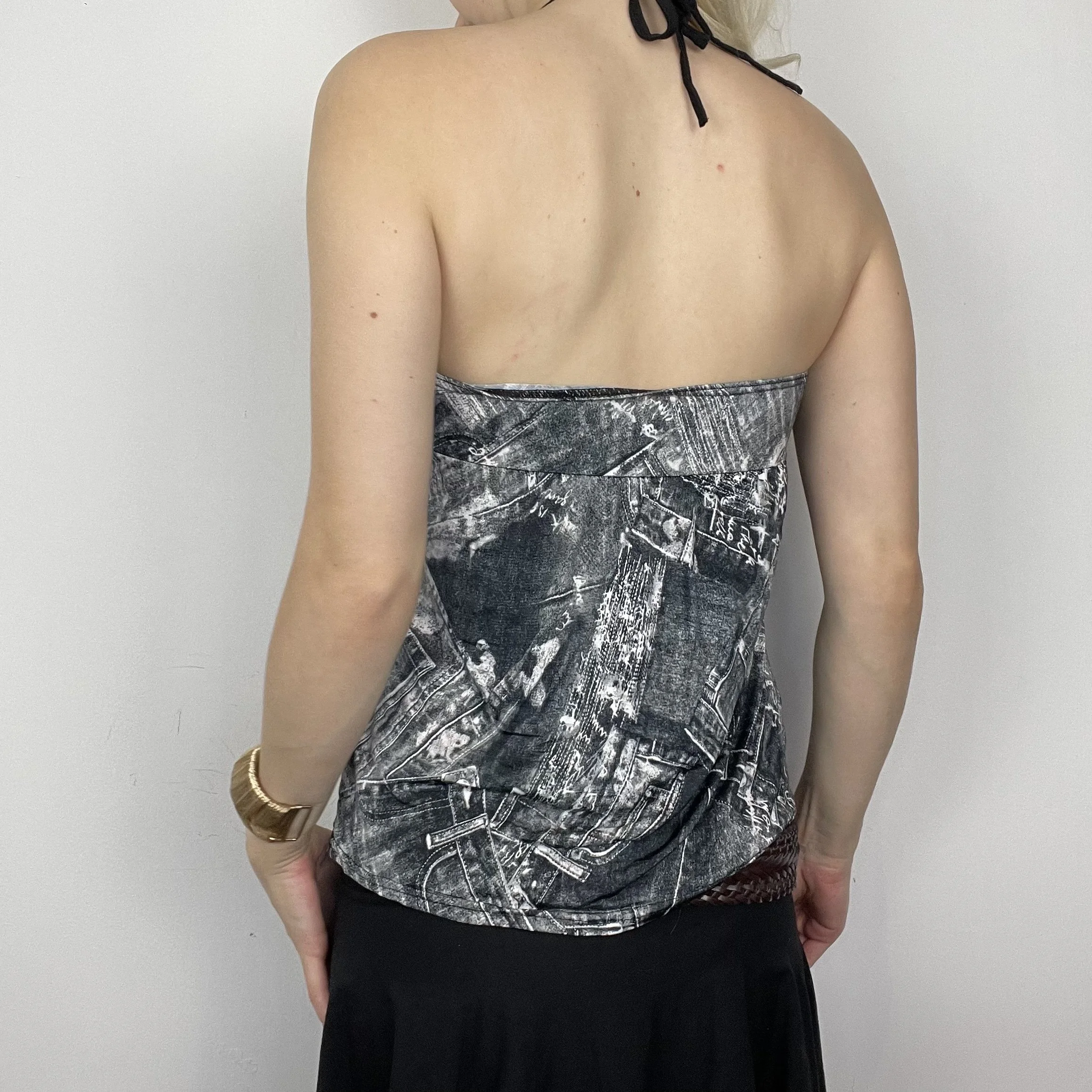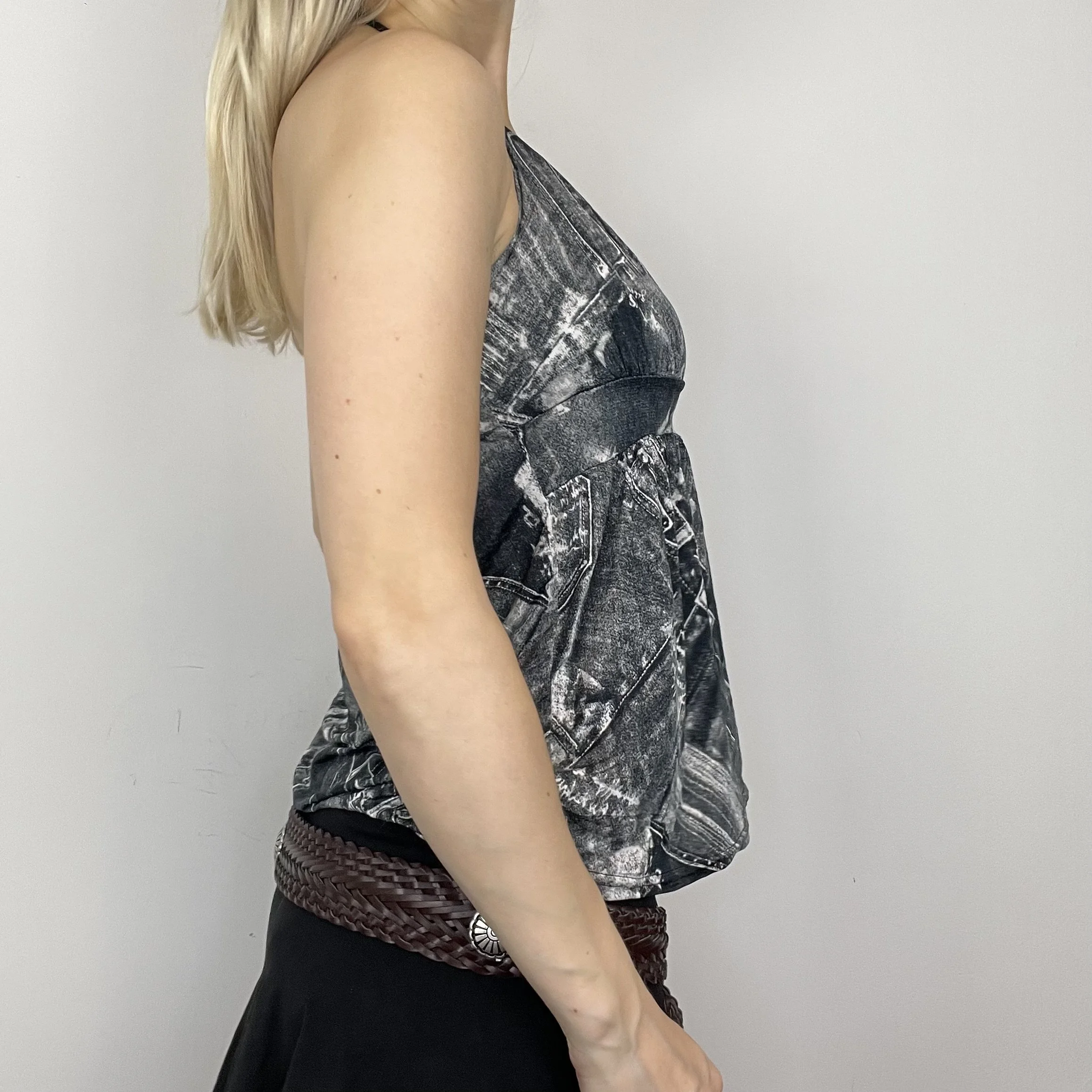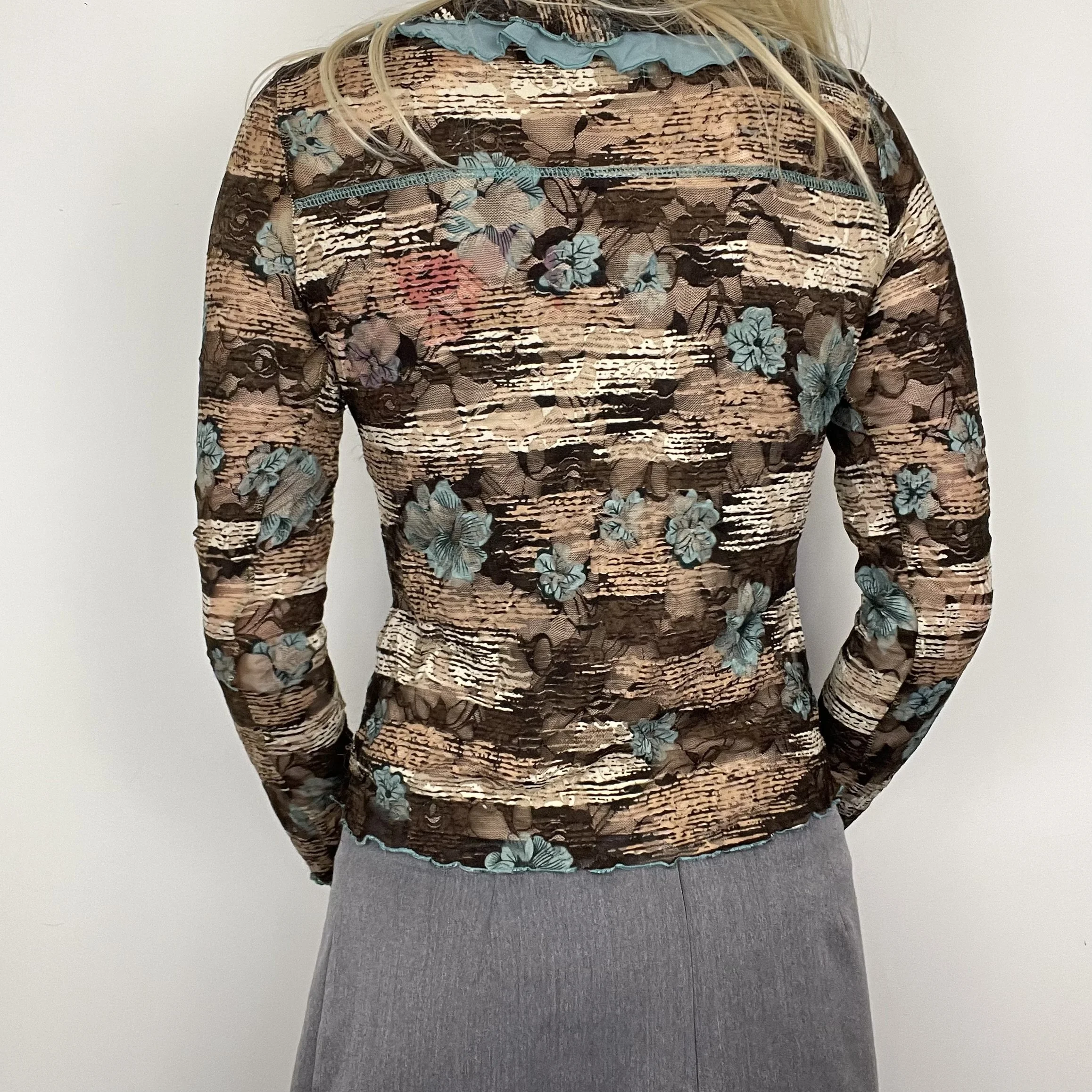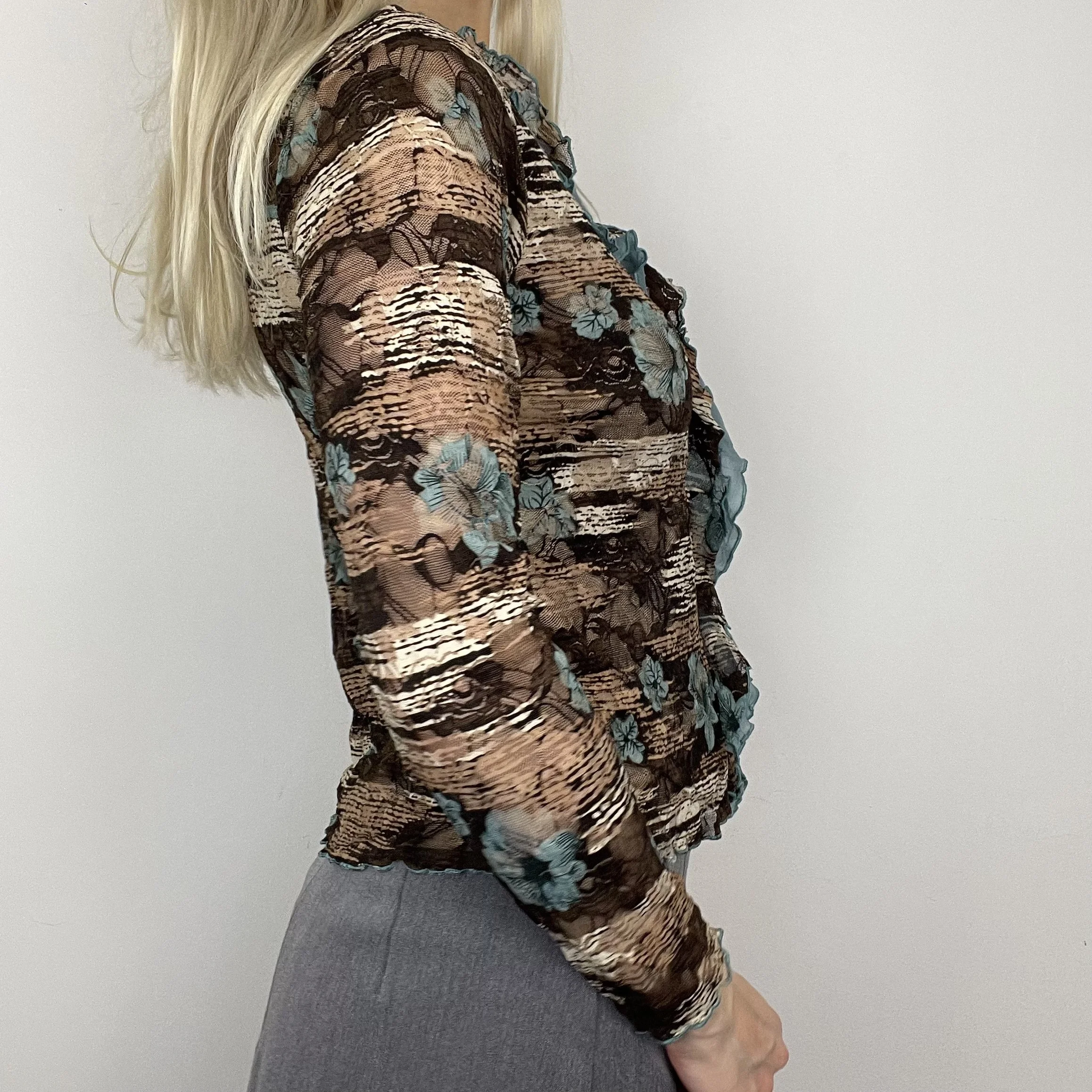 stunning y2k vintage blue brown white frilly ruffle fairy lace button up three-quarter length sleeve mesh patterned top blouse