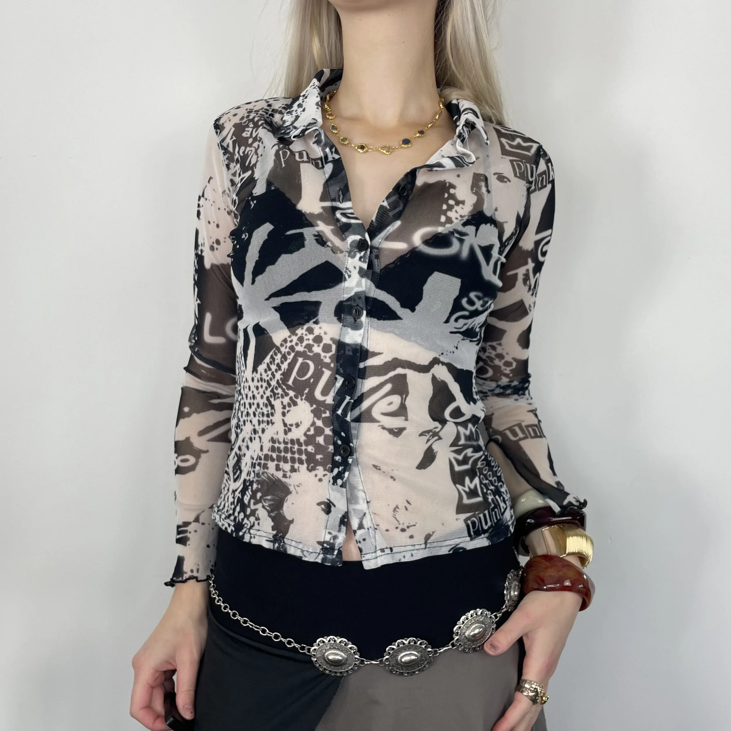 stunning y2k vintage punk black and white monochrome patterned abstract graphic print mesh sheer long sleeve button up shirt blouse top with writing print